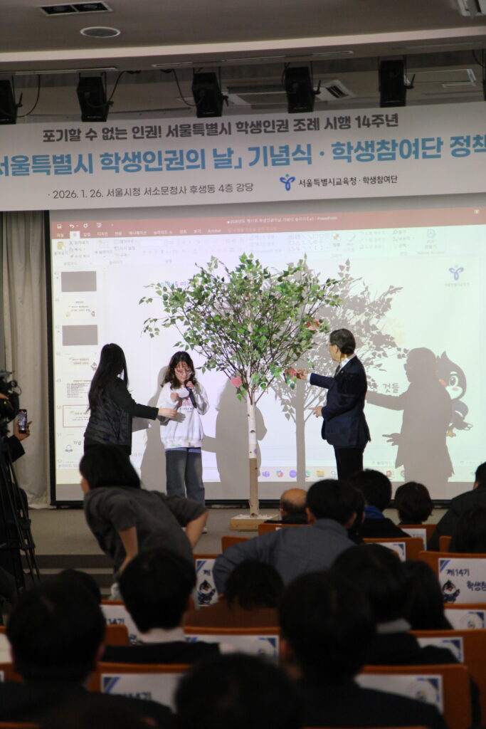 이러한 풍파 속에서도 기념식은 학생들과 교육 관계자들이 참석한 가운데 계획대로 진행되었다. 행사는 여러 프로그램들로 채워졌다. 제14기 학생참여단은 지난 1년간의 활동을 보고하며 현장의 생생한 인권 정책을 제안했고, 예룸예술학교의 축하 공연은 장내 분위기를 달궜다. 학생참여단이 함께한 ‘인권나무 만들기’ 퍼포먼스는 조례 폐지라는 위기 속에서도 학생들의 권리는 굳건히 뿌리내려야 한다는 의지를 상징적으로 보여주었다.