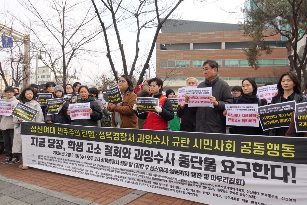 지난 11일 오후 2시, 서울 성북경찰서 앞에는 ‘성신여대 민주주의 탄압 분쇄 시민사회 공동대책위’(이하 공대위) 소속 활동가들과 학생들이 집결해 기자회견을 열고 학교와 경찰 당국을 강하게 비판했다.