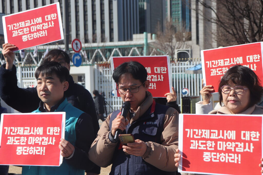 기간제교사노조 조합원 자격으로 발언에 나선 한 기간제교사는 “단 하루의 단절도 없이 지속 근무하면서도 학교를 옮길 때마다 신규채용으로 분류돼 매년 마약검사를 받아야 한다”며 병원 접수 창구에서 느꼈던 위축감과 모멸감을 생생하게 증언했다. 그는 또 감기약·소염제 복용만으로도 위양성 반응이 나올 수 있어 재검사에 따른 추가 비용과 정신적 스트레스까지 떠안는 실태를 지적했다.